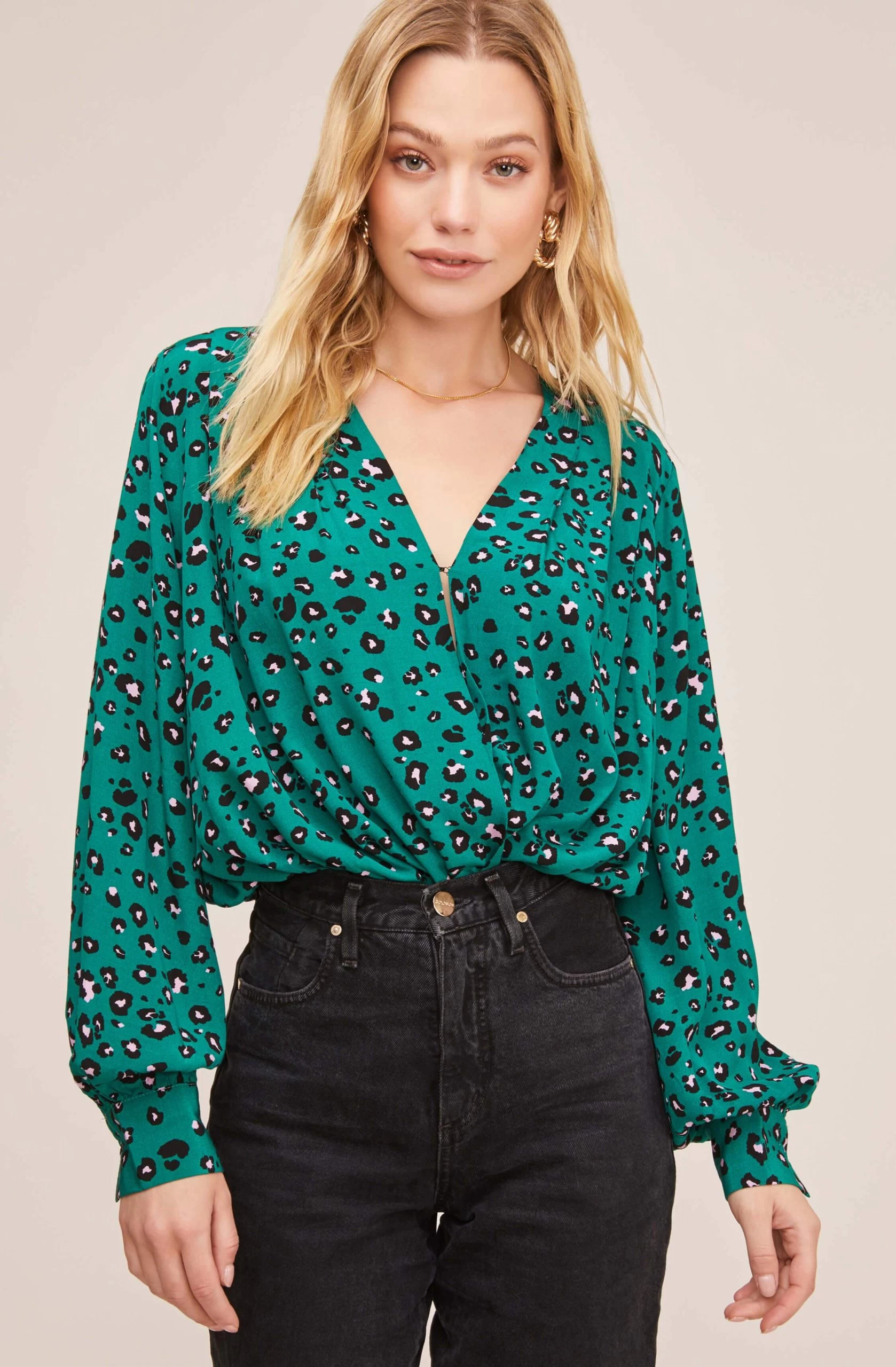 A one-piece wonder just in time for fall, this leopard printed bodysuit is a winner. Featuring a plunging neckline and wrapped front, this bodysuit can be dressed up or down! Long cuff sleeves. Snap tape closure.