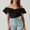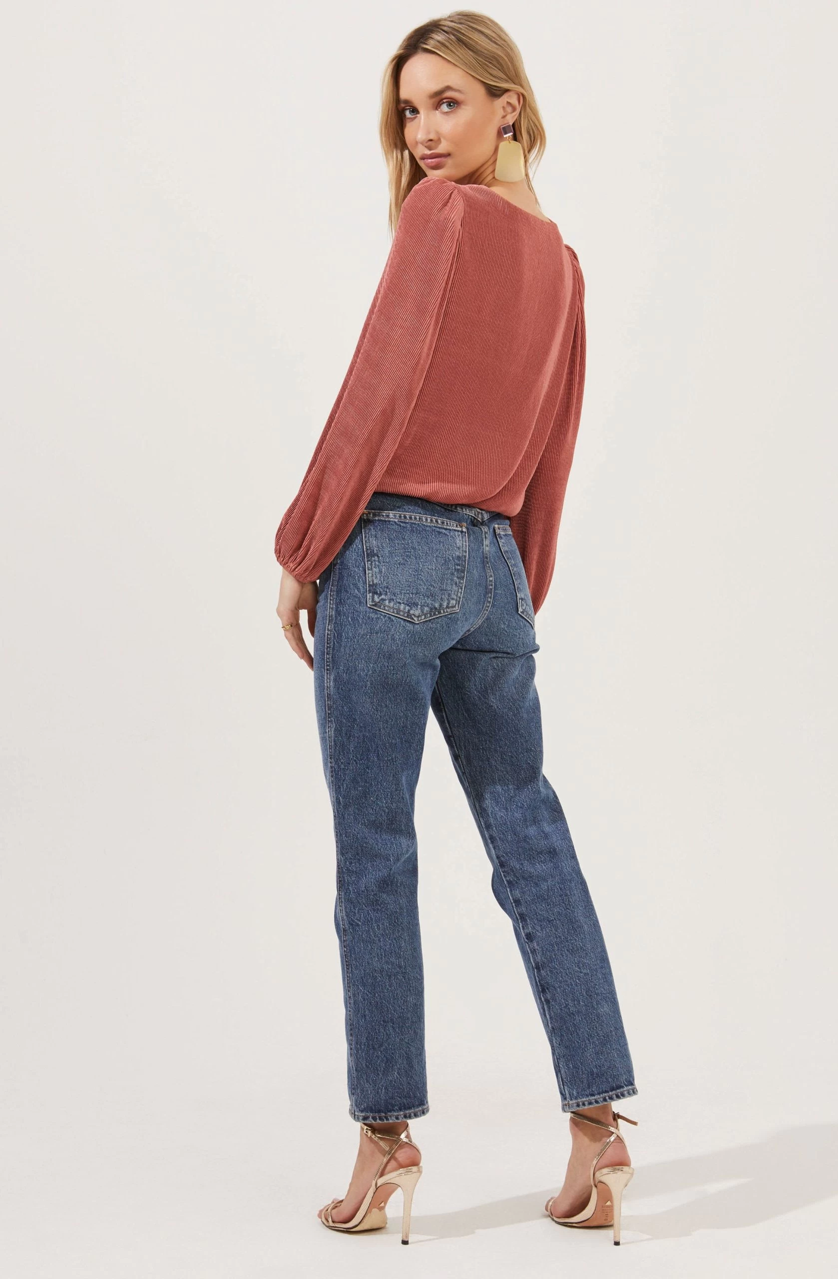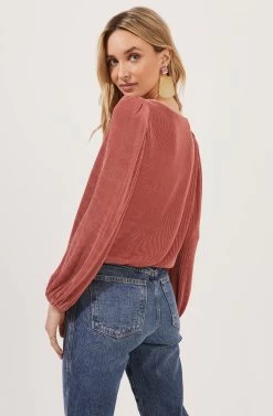 The Valdez Top features a V neckline that descends to a surplice front with a hook-and-eye closure. Padded shoulders. Long sleeves with elastic cuffs.
