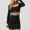 The Vania Dress features a ribbed knit construction that starts with a halter neckline and tying straps. Open back. Bodycon silhouette.