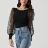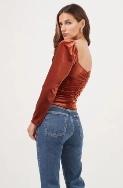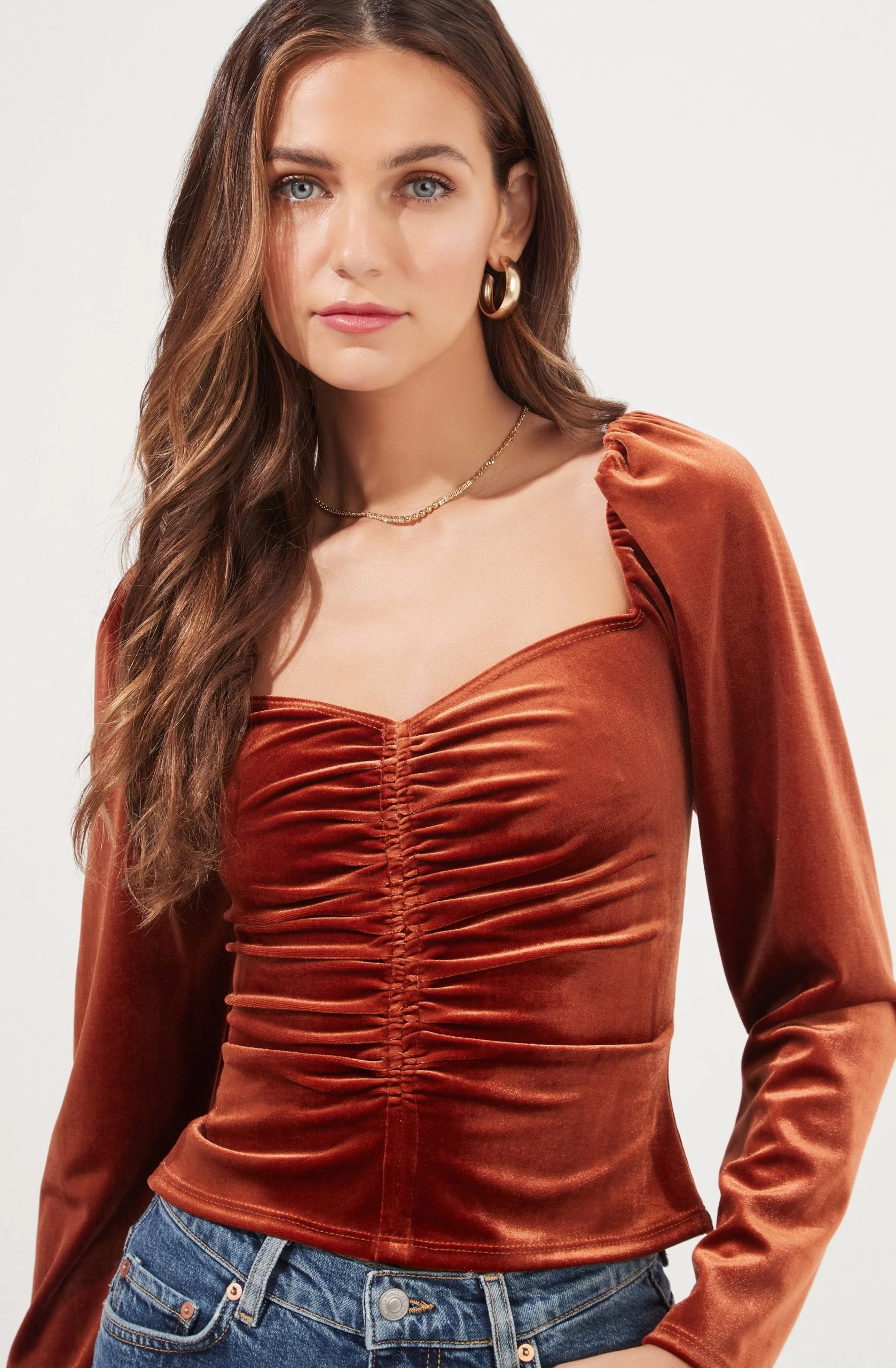 Festive looks are here. The Vanya Top features a sweetheart neckline that leads to a ruched bodice. Long sleeves with statement shoulders. Low cut back.