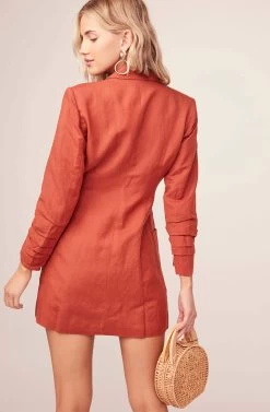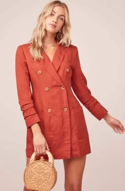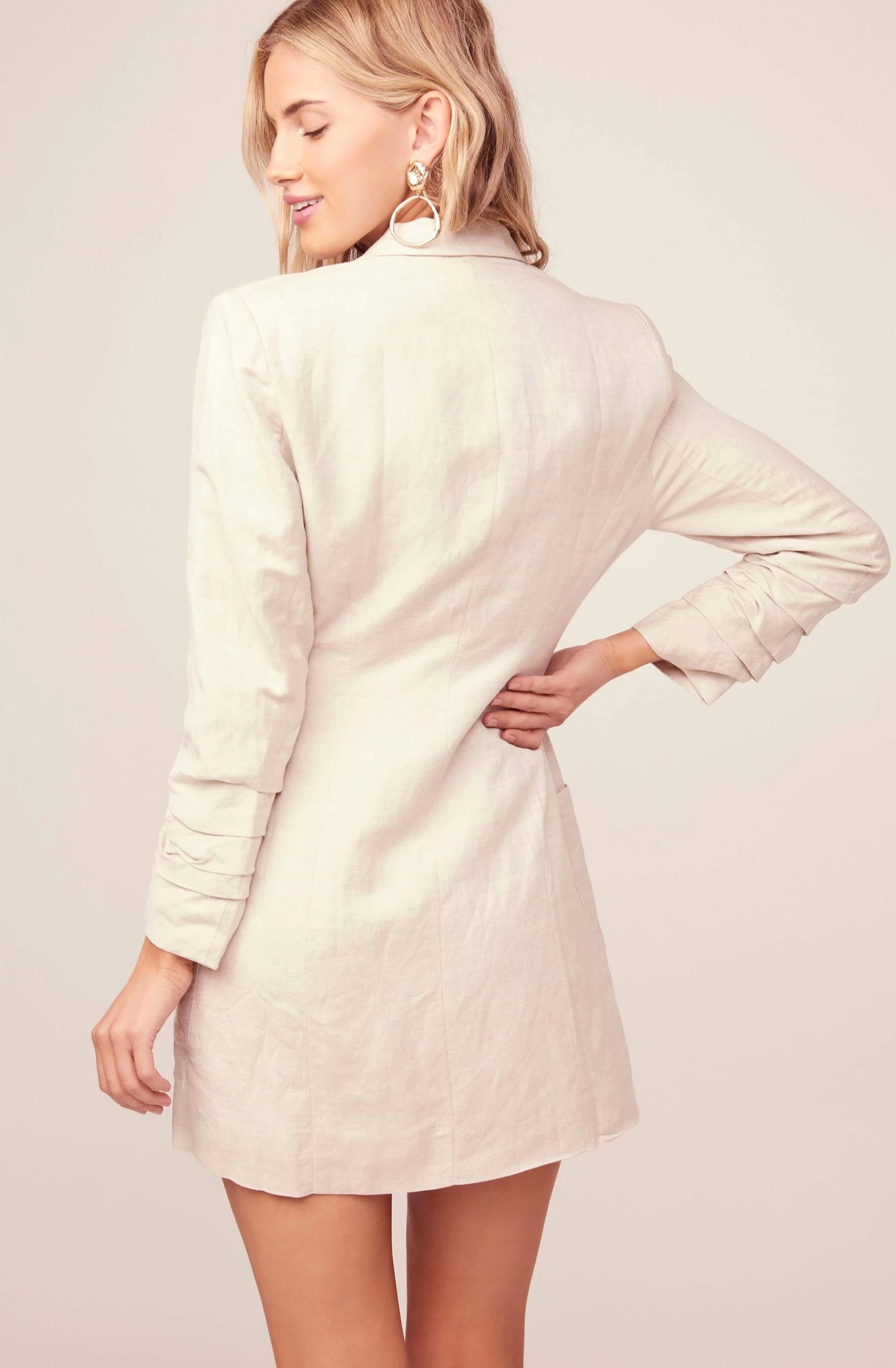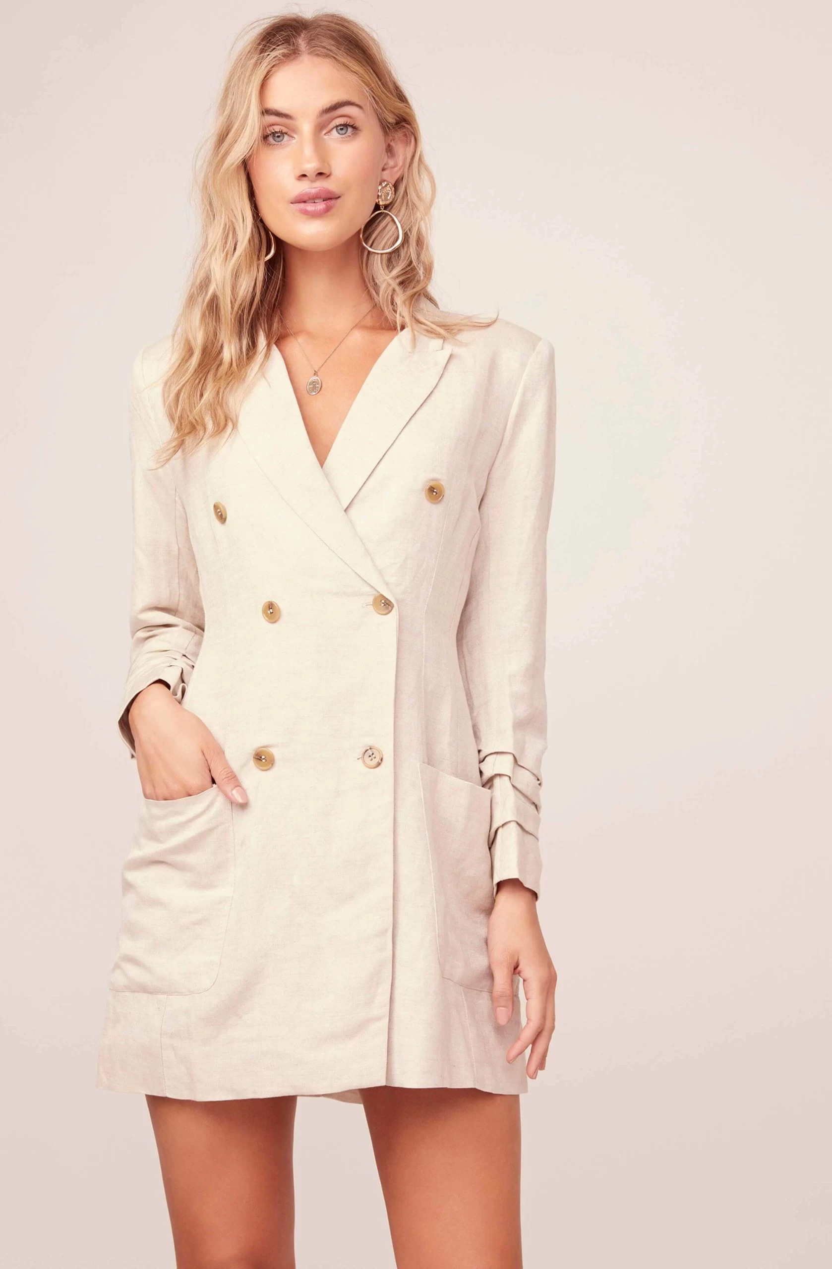 Summers at the office don’t need to be boring! This stylish linen blazer dress features a notched collar that leads to a double breasted front and darted bodice. Long ruched sleeves and oversized side patch pockets punctuate this look.