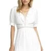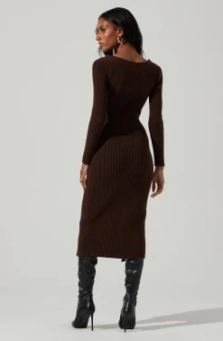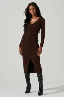 The Vesper Dress features a ribbed knit construction. V neckline leads to a cable knit trim along the front. Long sleeves. Front slit accent. Midi-length.