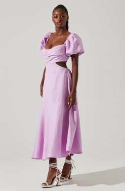 The Winley Dress has a sweetheart neckline that leads to side cutout accents and open back. Short puff sleeves. Midi-length skirt. Supportive, elastic back strap. Concealed back zip closure.