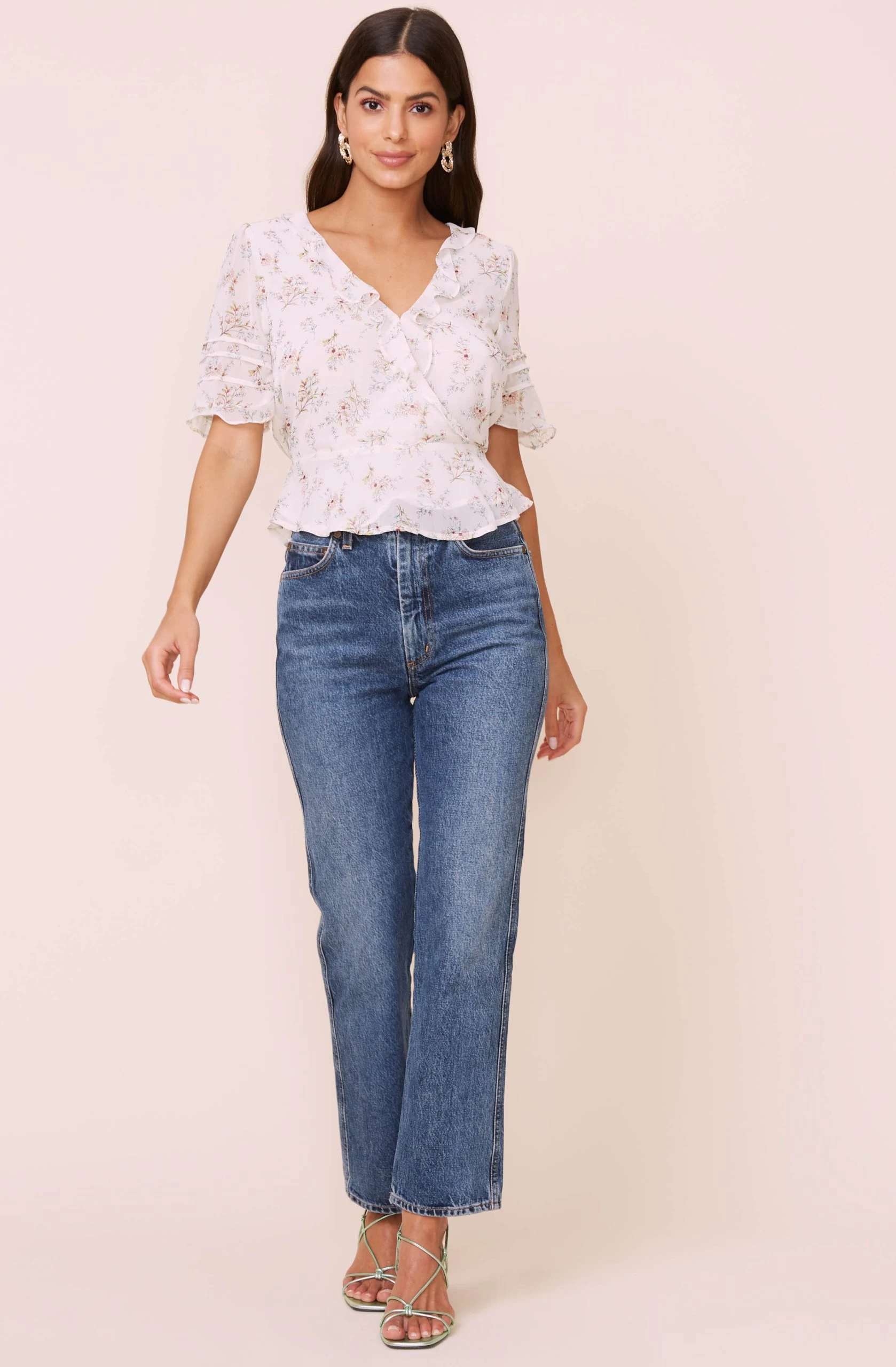 Keep it sweet in this summer-ready top. It features a ruffle trimmed V neckline that descends to a wrapped front. Delicate floral print throughout. Short sheer sleeves.