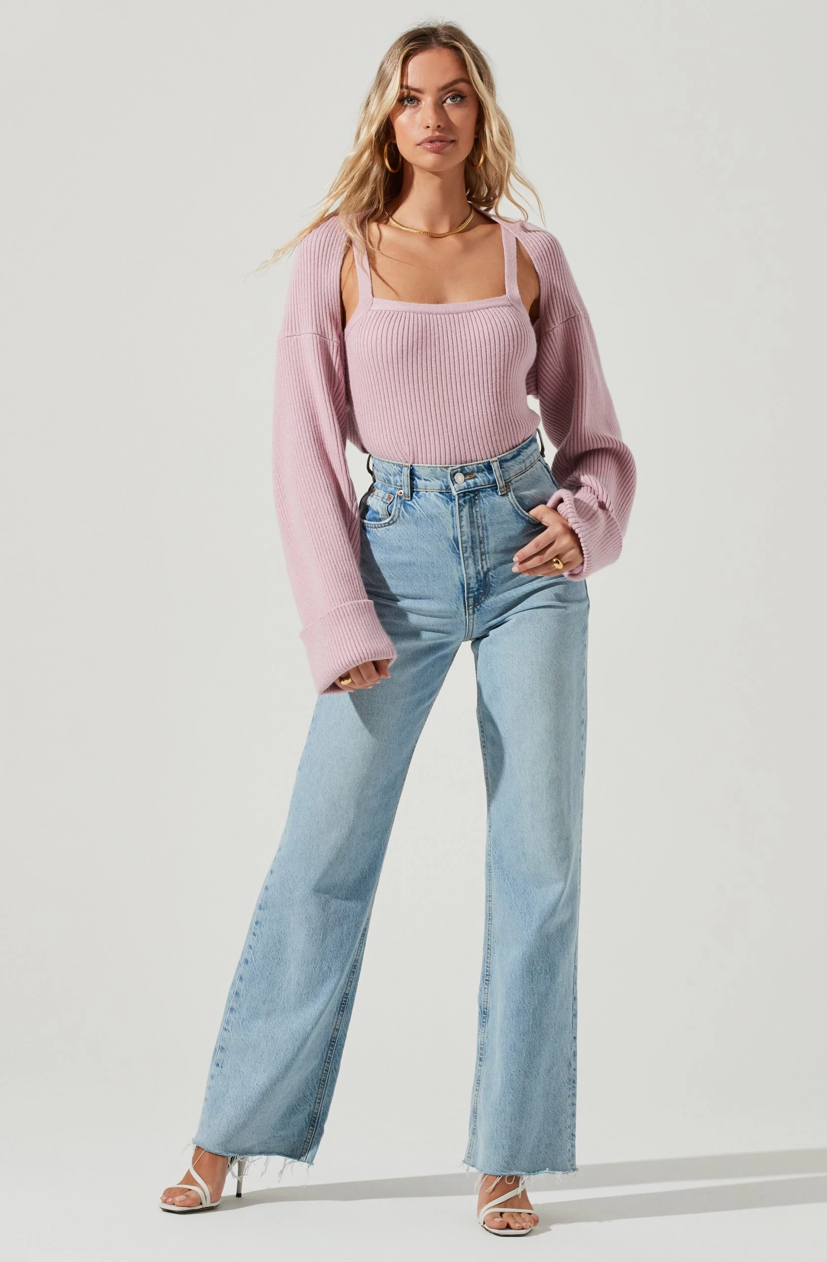 This sweater set features a cropped shrug sweater that matches a square neck cami tank top. Slight stretch. Long sleeves.