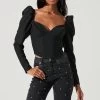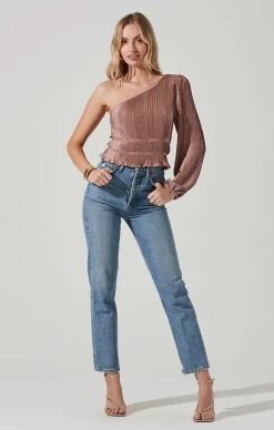 The Zona Top features a textured plisse finish. Asymmetrical neckline leads to a one shoulder silhouette with a long sleeves. Peplum waist.