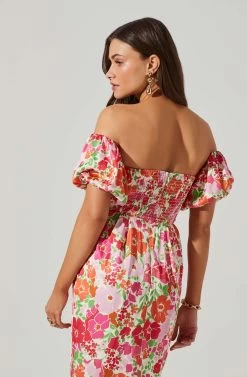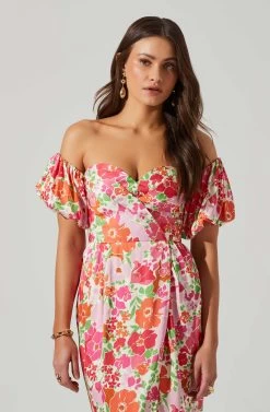 The Zurina Dress features a striking floral print throughout. Off shoulder neckline leads to a sweetheart bust and wrapped bodice. Wrapped midi-length skirt. Short puff sleeves. Smocked back.